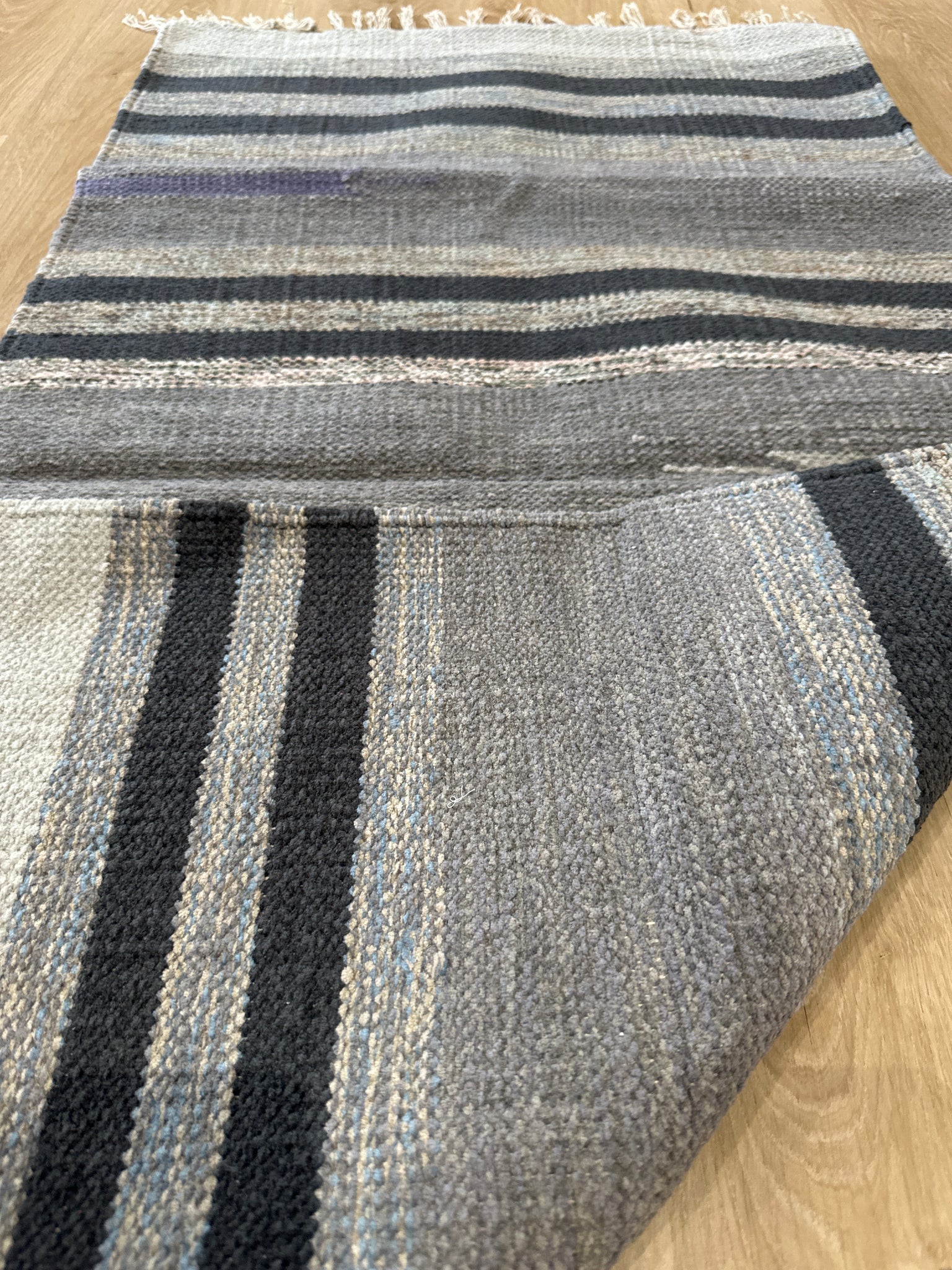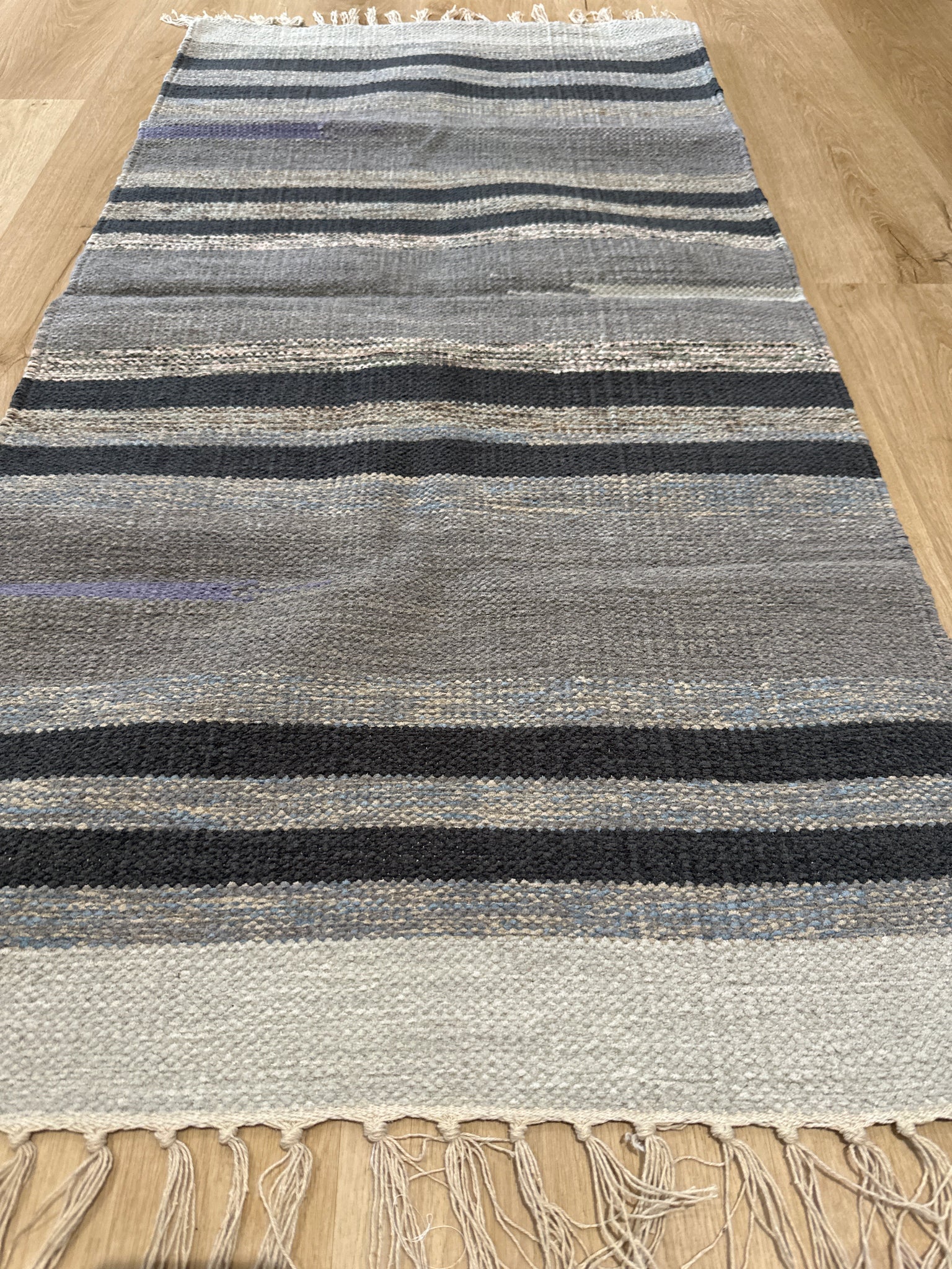 Kék ,szürke, bézs színű csíkos indiai pamut szőnyeg: